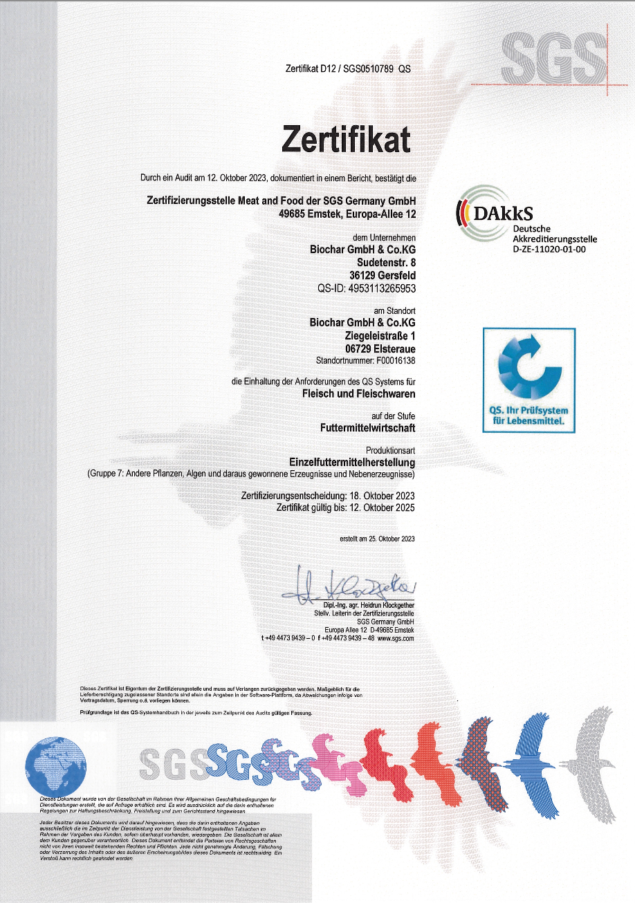Als erfahrene Produzenten von Biokohle bieten wir nicht nur innovative Lösungen für die Landwirtschaft, sondern auch ein nachhaltiges Produkt für technische Anwendungen für die der Klimaschutz eine immer größere Rolle spielen wird. Unser Ziel ist es, hochwertige Biokohle-Produkte zu liefern, die ökologisch und ökonomisch klug sind. Als eines der wenigen deutschen Unternehmen sind wir zudem QS-zertifizierter Futtermittelhersteller, was die Qualität und Anwendungssicherheit unserer Biokohle zusätzlich unterstreicht und unseren hohen Standard in der Produktion bestätigt.